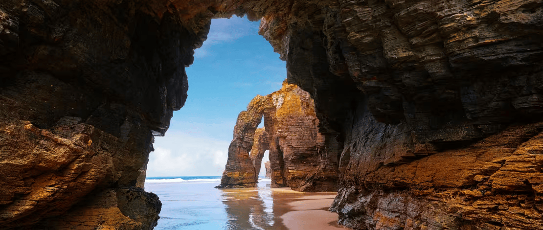 A Playa de las Catedrales, em Ribadeo, na Galícia, é daquelas praias que parecem ter sido esculpidas por deuses. As formações rochosas imensas, que lembram arcos de catedrais, criam um cenário surreal: principalmente na maré baixa, quando dá pra caminhar por túneis e passagens naturais. É um dos lugares mais impressionantes do norte da Espanha e merece estar na lista de qualquer viagem pela região.