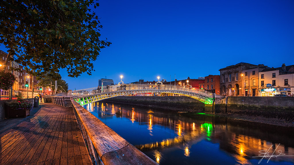 A icônica Ha'Penny Bridge é uma charmosa ponte de pedestres que se tornou um símbolo de Dublin, ligando as margens do rio com seu elegante design de ferro fundido.
