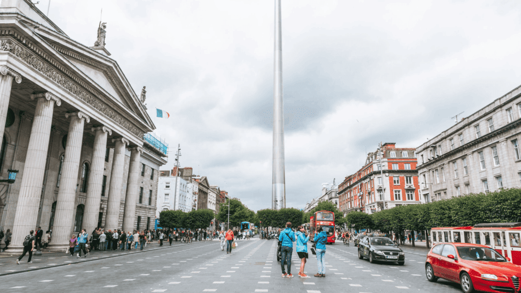 O'Connell Street é a principal avenida de Dublin, cheia de lojas e monumentos. Esta vibrante rua é onde a cultura irlandesa ganha vida, especialmente durante o St. Patrick's Day.