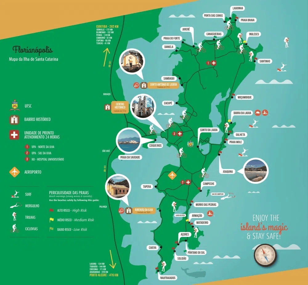 Descubra as principais atrações de Florianópolis com este simples, porém eficaz, mapa que destaca os pontos turísticos mais visitados da ilha. É um ótimo recurso para planejar sua viagem.