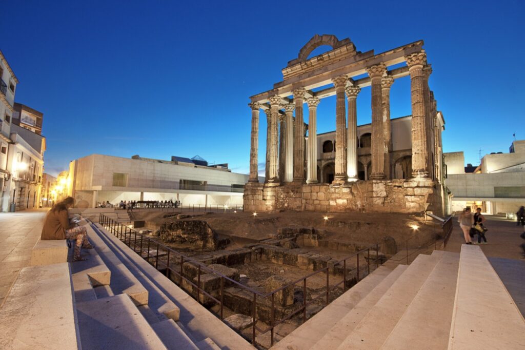 Construído no século I a.C., o Templo de Diana destaca-se pela grandiosidade de suas colunas. É uma amostra da arquitetura romana, localizada no coração de Mérida.
