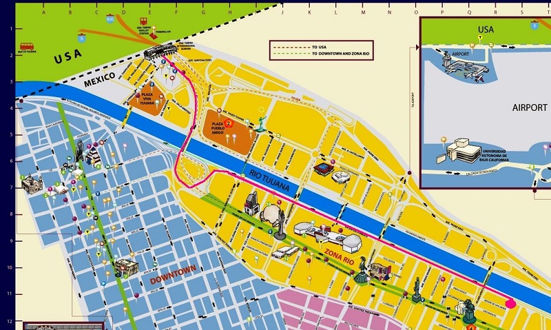 Esse mapa simples ilustra onde estão as principais atrações de Tijuana, contribuindo para uma melhor programação da visita e aproveitamento das ofertas culturais e turísticas.